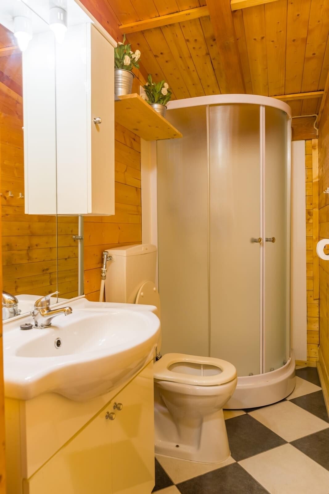 Complete badkamer: Douchecabine, toilet, wastafel.